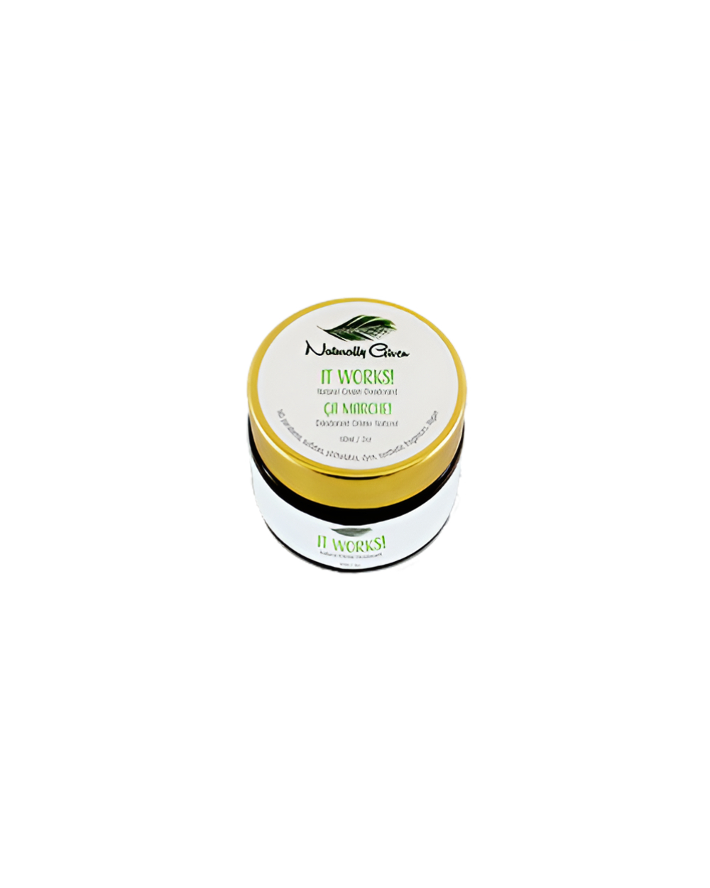 Ingredients: Coco Nusifera (coconut) oil, vitellaria paradoxa (shea nut butter) oil, Zea Mays amylacea (cornstarch), Hydrogencarbonate (baking soda), Beeswax (cera alba), citrus paradisii (grapefruit) oil, It Works pure essential oil blend.